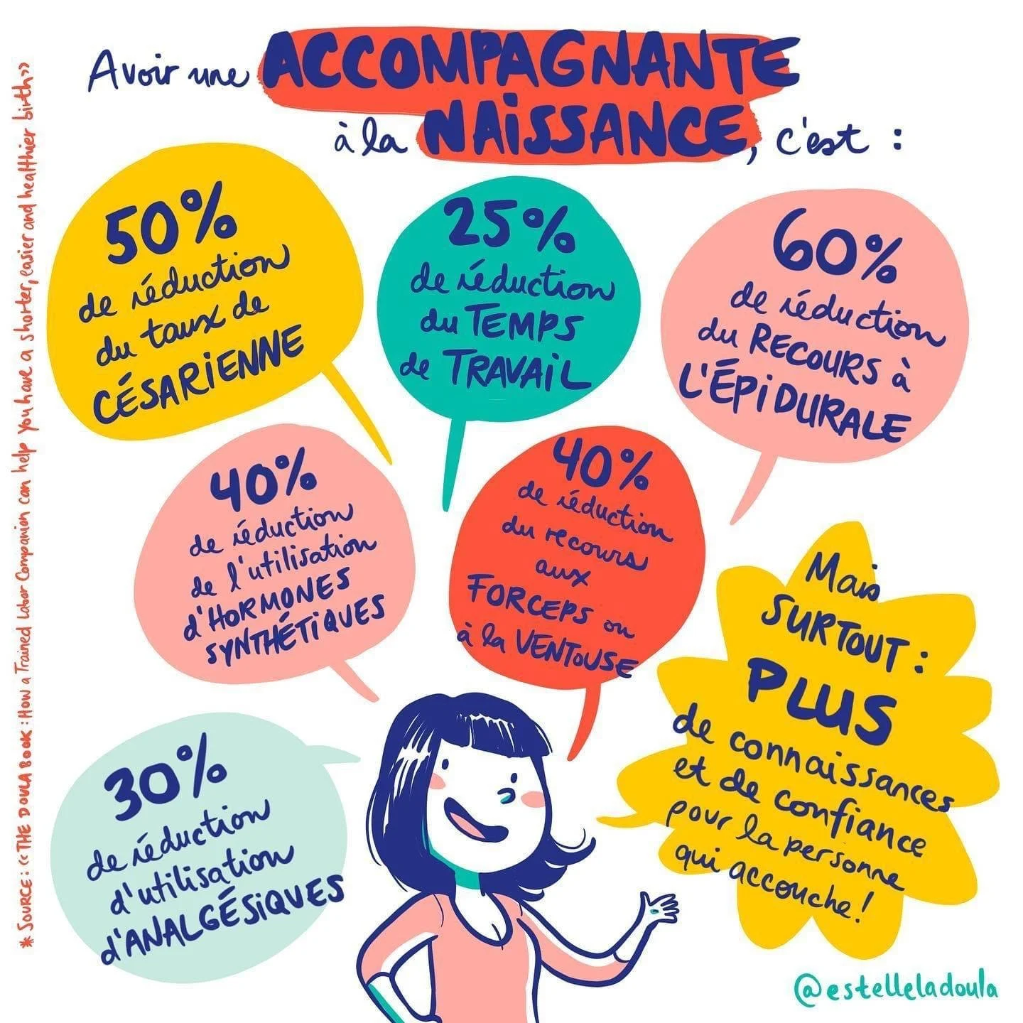 The Doula Book How a Trainer Labor Companion Can Help You Have a Shorter, Easier and Healthier Birth Second edition- by Marshall, Phyllis Klaus and John Kennell (Perseus Press, 2002). Voir aussi le document publié par MIDIRS (the Midwives Information and Resource Service, Grande Bretagne) “Support in labor” (soutien pendant l’accouchement) qui présente les statistiques de 10 études randomisées contrôlées portant sur plus de 3000 femmes.