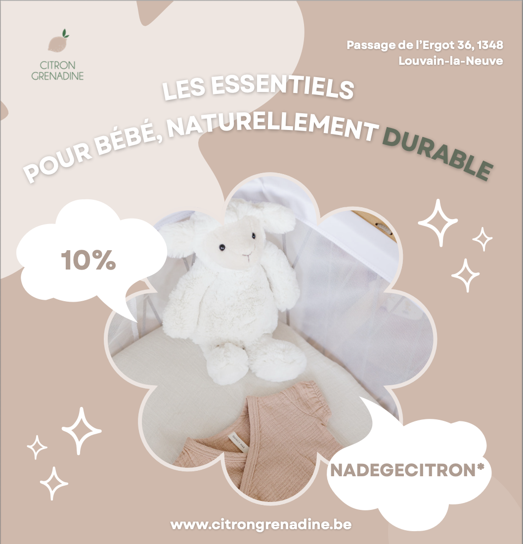 Situé au cœur de Louvain-la-Neuve, Citron Grenadine accompagne depuis plus de 15 ans les jeunes parents dans une démarche de naissance durable. Chaque produit est choisi avec soin pour sa qualité, sa sécurité et son impact positif sur l’environnement.